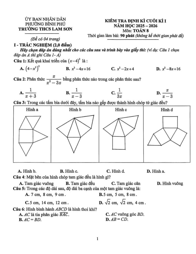 Trích dẫn Đề cuối kì 1 Toán 8 năm 2025 – 2026 trường THCS Lam Sơn – TP HCM: