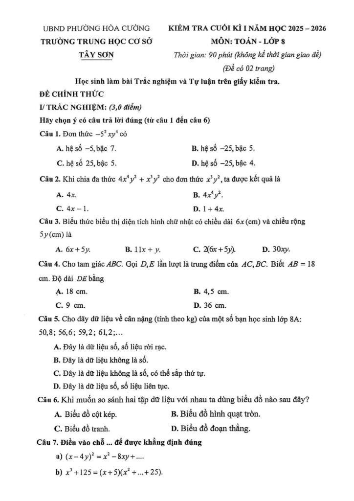 Trích dẫn Đề cuối kì 1 Toán 8 năm 2025 – 2026 trường THCS Tây Sơn – Đà Nẵng: