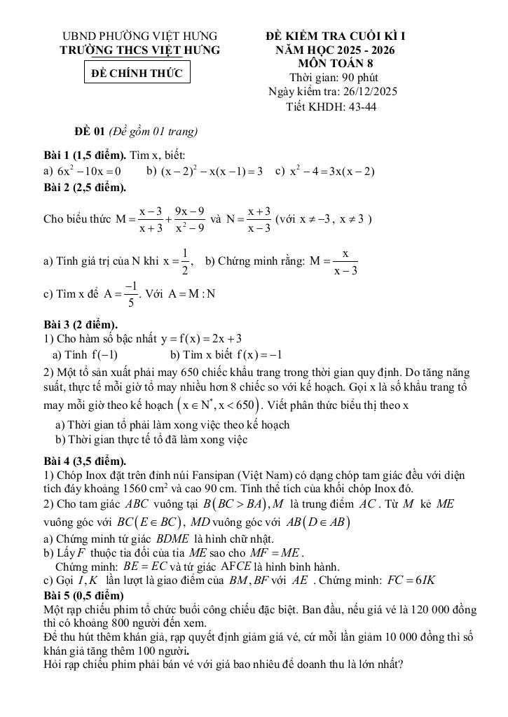 Trích dẫn Đề cuối kì 1 Toán 8 năm 2025 – 2026 trường THCS Việt Hưng – Hà Nội: