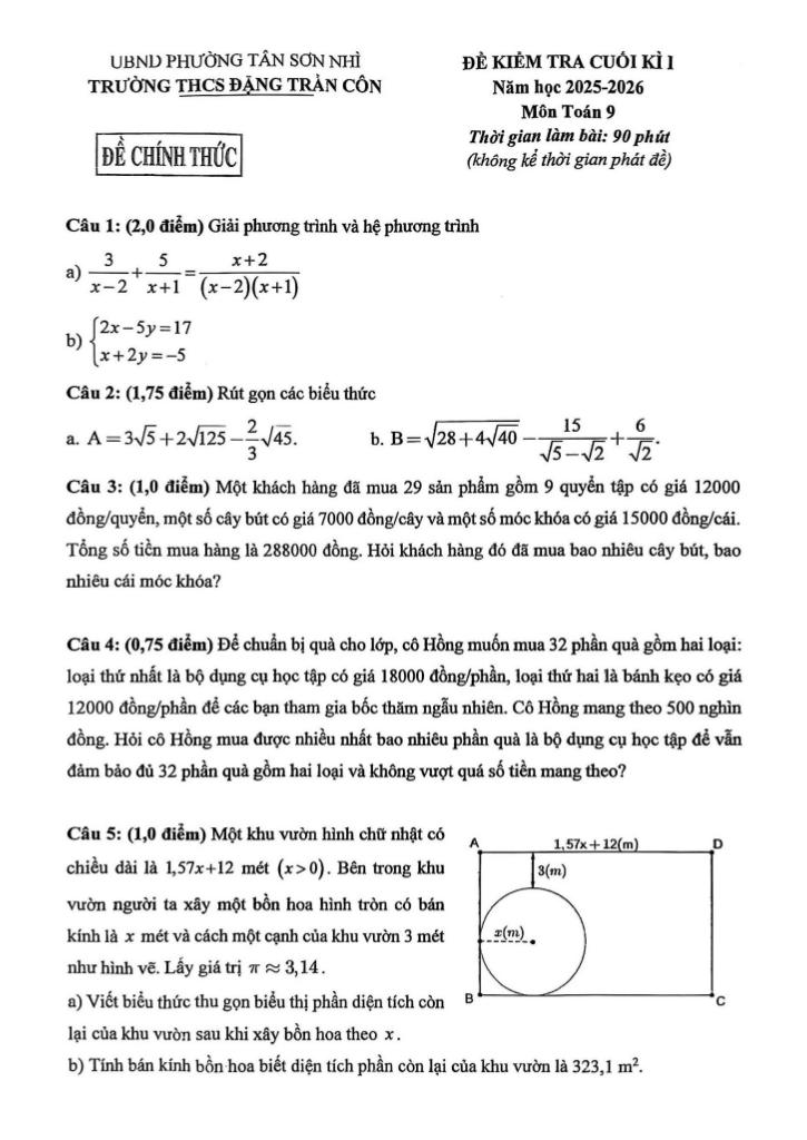 Trích dẫn Đề cuối kì 1 Toán 9 năm 2025 – 2026 trường THCS Đặng Trần Côn – TP HCM: