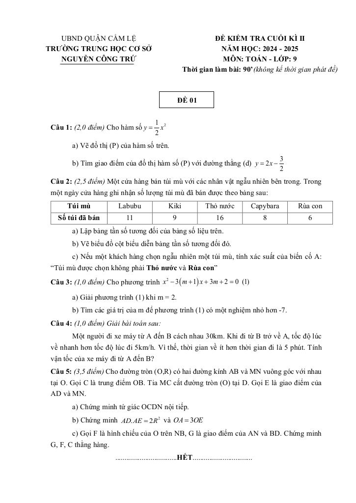 MonToan.com.vn giới thiệu đến quý thầy, cô giáo và các em học sinh đề kiểm tra cuối học kì 2 môn Toán 9 năm học 2024 – 2025 trường THCS Nguyễn Công Trứ, quận Cẩm Lệ, thành phố Đà Nẵng. Đề thi có đáp án và hướng dẫn chấm điểm.