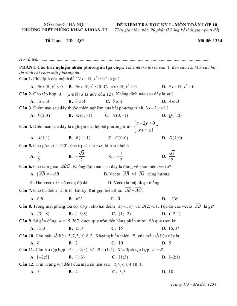 Trích dẫn Đề cuối kỳ 1 Toán 10 năm 2025 – 2026 trường THPT Phùng Khắc Khoan – Hà Nội: