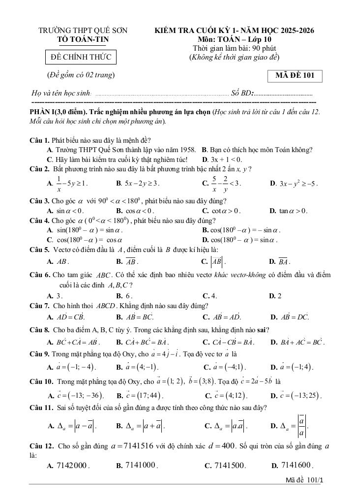 Trích dẫn Đề cuối kỳ 1 Toán 10 năm 2025 – 2026 trường THPT Quế Sơn – Đà Nẵng: