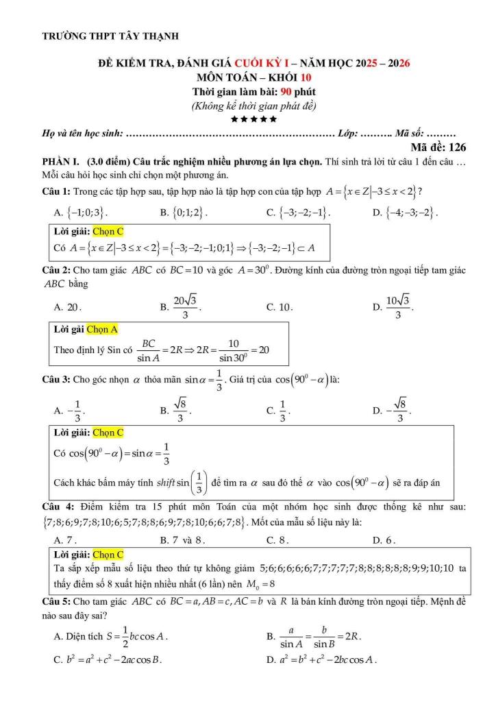 Trích dẫn Đề cuối kỳ 1 Toán 10 năm 2025 – 2026 trường THPT Tây Thạnh – TP HCM: