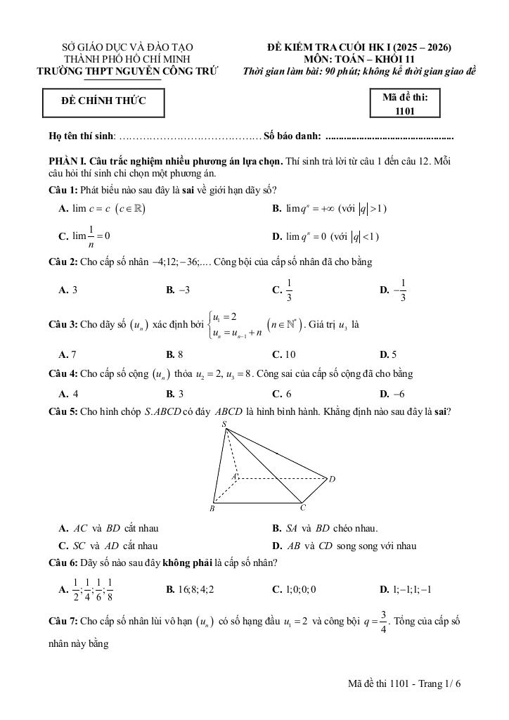 Trích dẫn Đề cuối kỳ 1 Toán 11 năm 2025 – 2026 trường THPT Nguyễn Công Trứ – TP HCM: