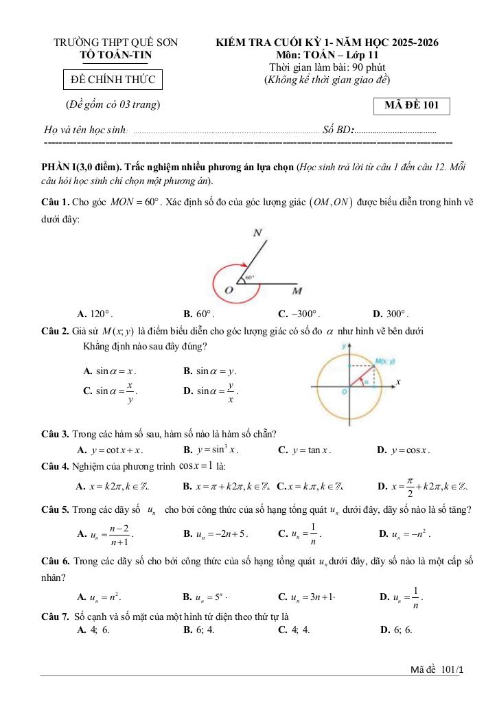 Trích dẫn Đề cuối kỳ 1 Toán 11 năm 2025 – 2026 trường THPT Quế Sơn – Đà Nẵng: