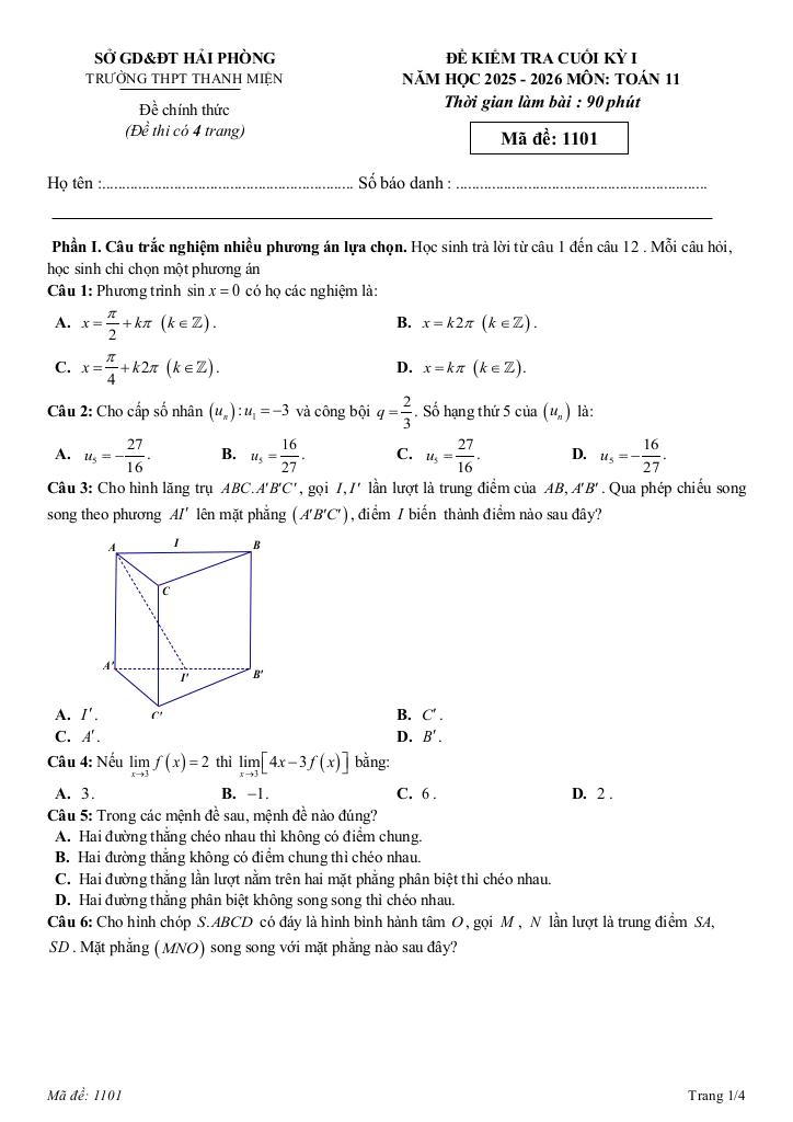 Trích dẫn Đề cuối kỳ 1 Toán 11 năm 2025 – 2026 trường THPT Thanh Miện – Hải Phòng: