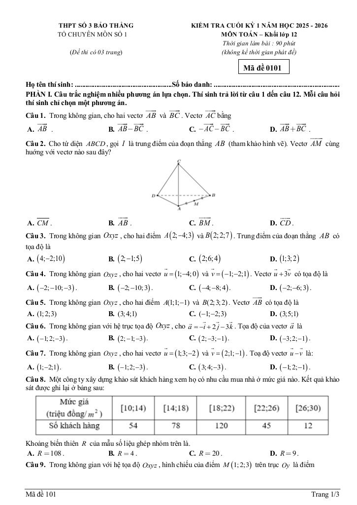 Trích dẫn Đề cuối kỳ 1 Toán 12 năm 2025 – 2026 trường THPT Bảo Thắng 3 – Lào Cai: