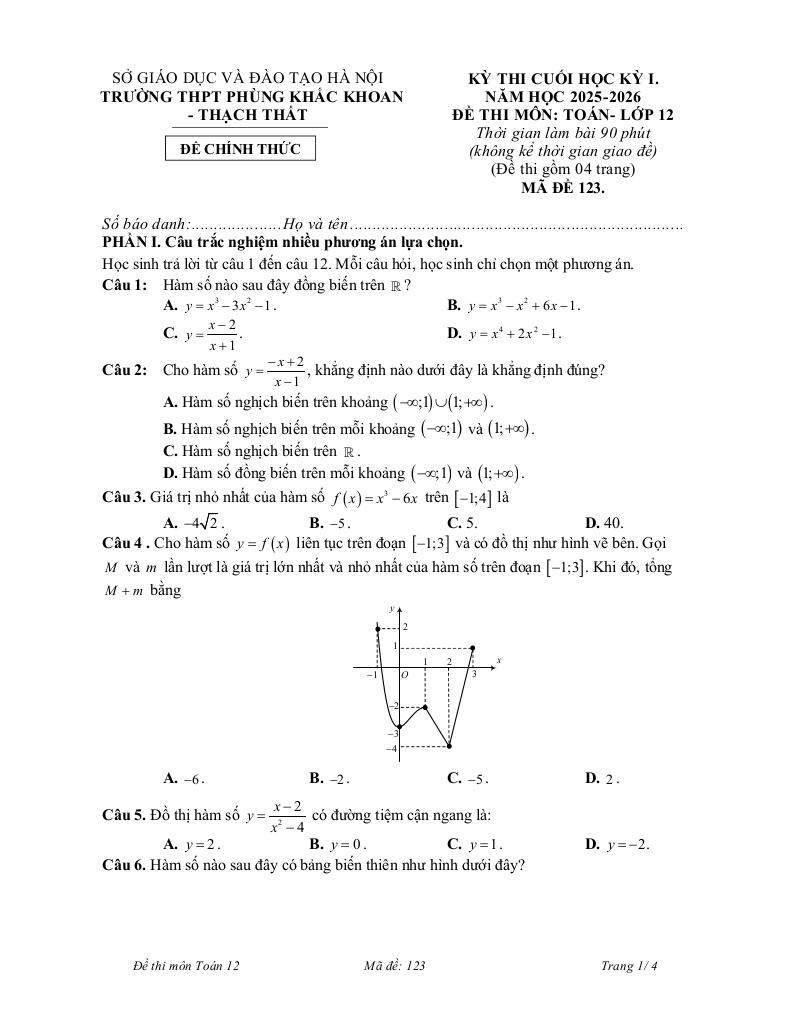 Trích dẫn Đề cuối kỳ 1 Toán 12 năm 2025 – 2026 trường THPT Phùng Khắc Khoan – Hà Nội: