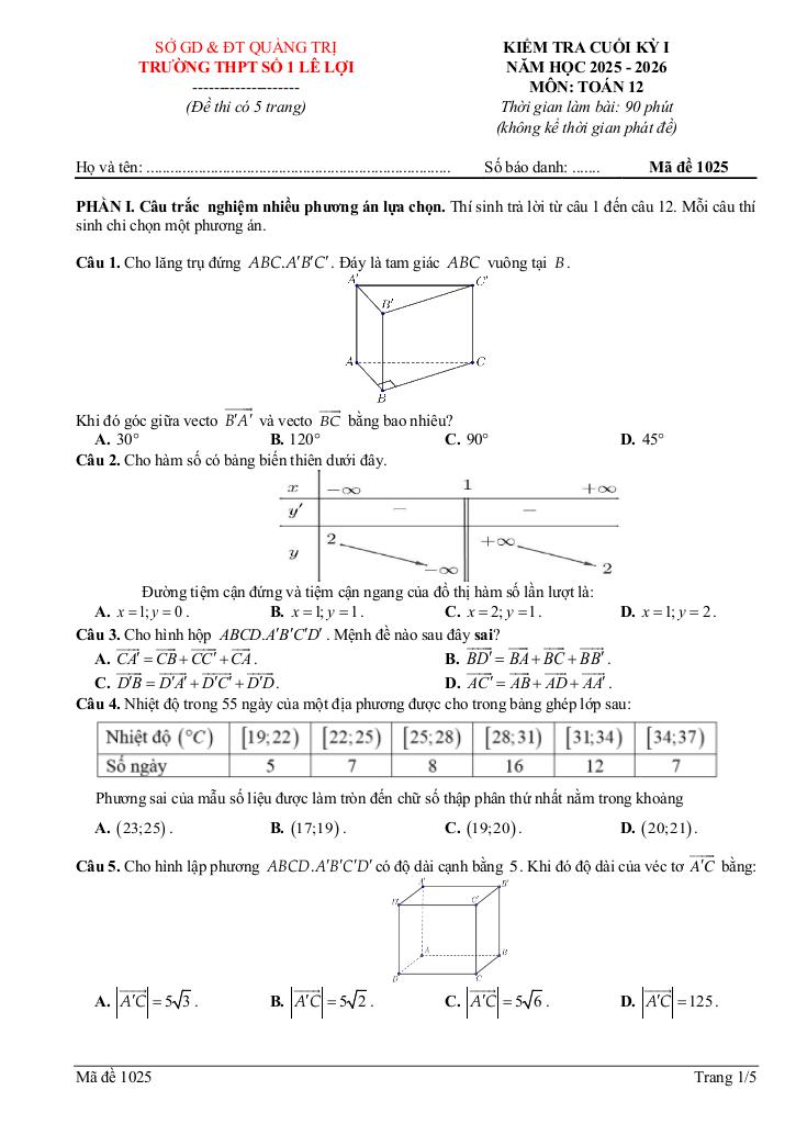 Trích dẫn Đề cuối kỳ 1 Toán 12 năm 2025 – 2026 trường THPT số 1 Lê Lợi – Quảng Trị: