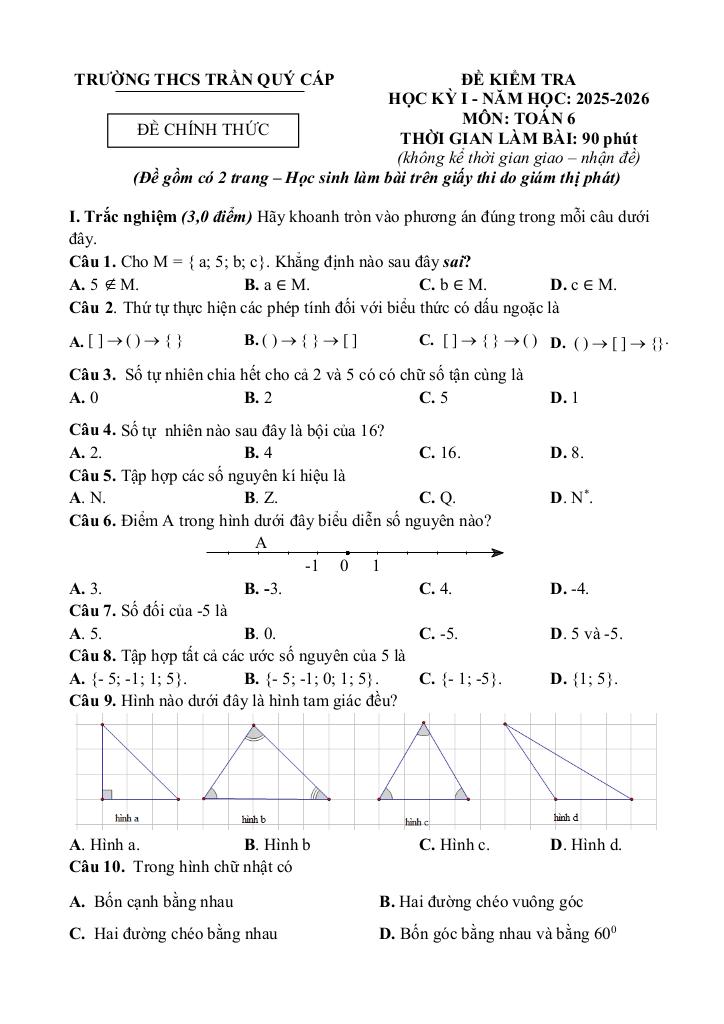 Trích dẫn Đề cuối kỳ 1 Toán 6 năm 2025 – 2026 trường THCS Trần Quý Cáp – Đà Nẵng: