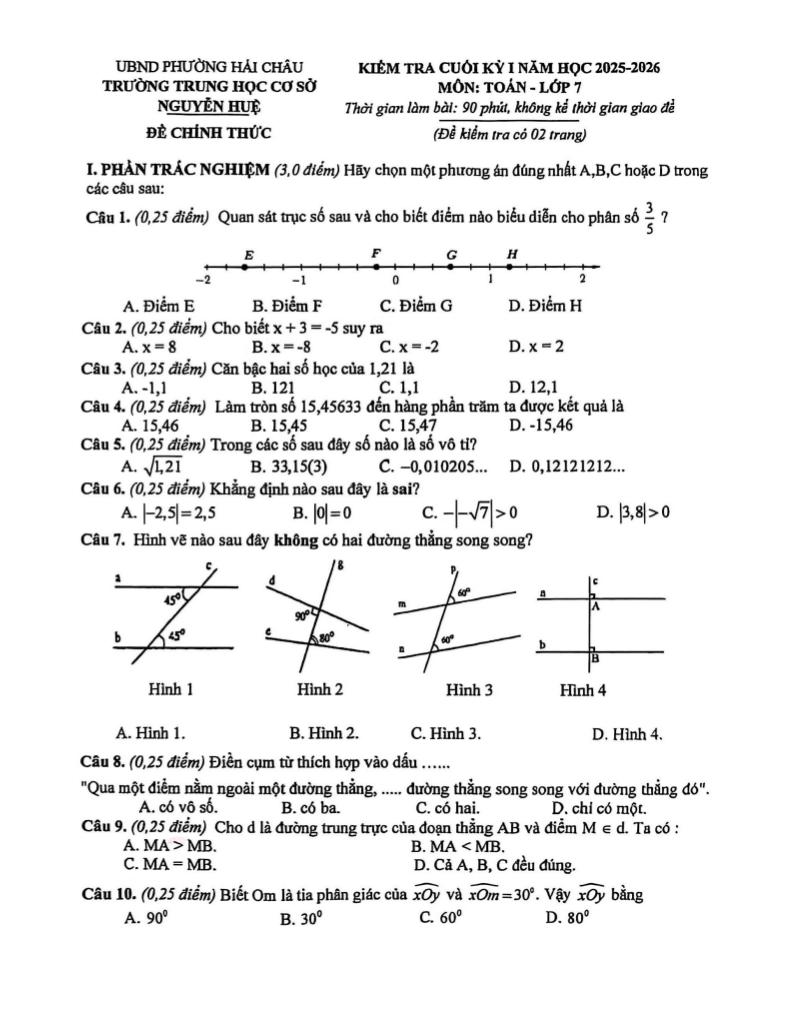 Trích dẫn Đề cuối kỳ 1 Toán 7 năm 2025 – 2026 trường THCS Nguyễn Huệ – Đà Nẵng: