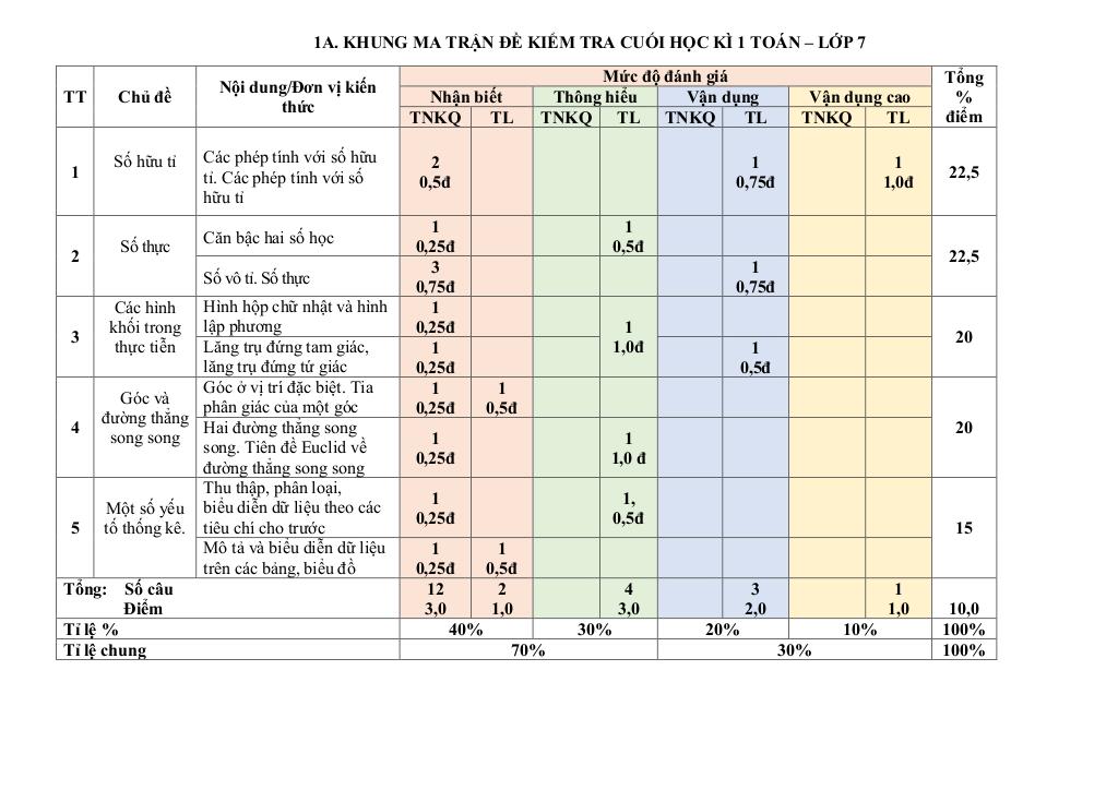 Ma trận Đề cuối kỳ 1 Toán 7 năm 2025 – 2026 trường THCS Phạm Đình Hổ – TP HCM: