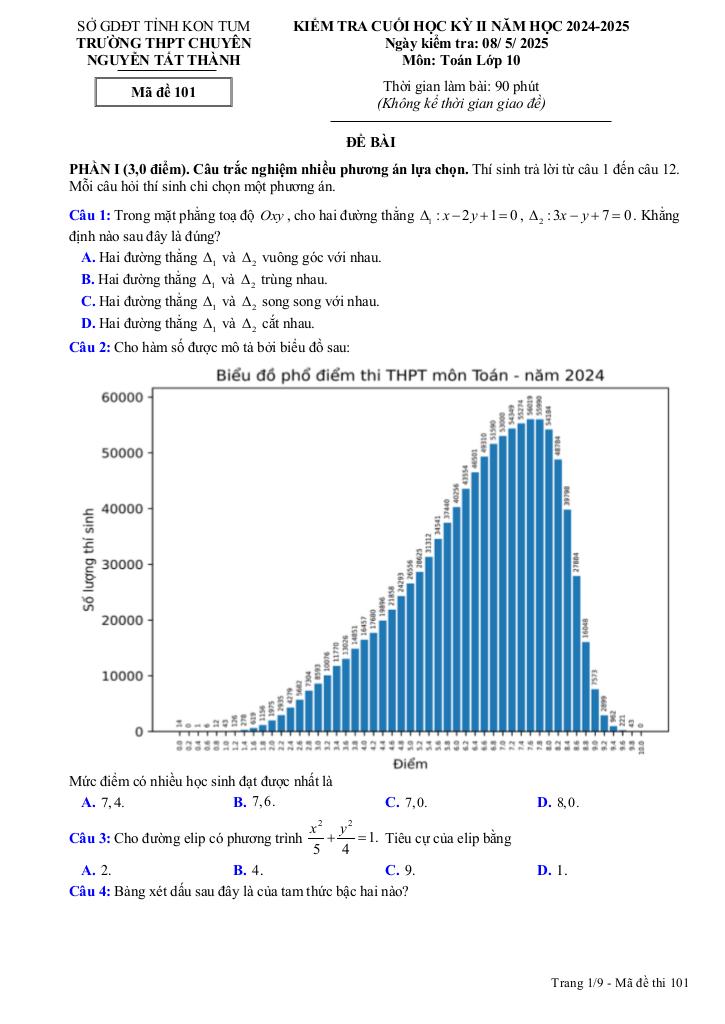 MonToan.com.vn giới thiệu đến quý thầy, cô giáo và các em học sinh lớp 10 đề kiểm tra cuối học kỳ 2 môn Toán 10 năm học 2024 – 2025 trường THPT chuyên Nguyễn Tất Thành, tỉnh Kon Tum. Kỳ thi được diễn ra vào ngày 08 tháng 05 năm 2025. Đề thi có đáp án và hướng dẫn chấm điểm.