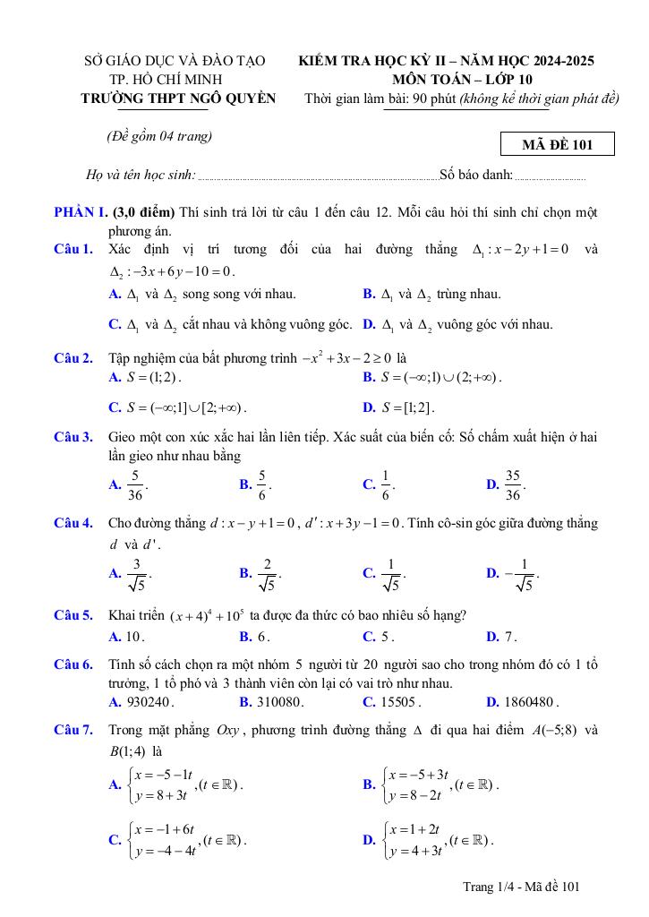 Trích dẫn Đề cuối kỳ 2 Toán 10 năm 2024 – 2025 trường THPT Ngô Quyền – TP HCM: