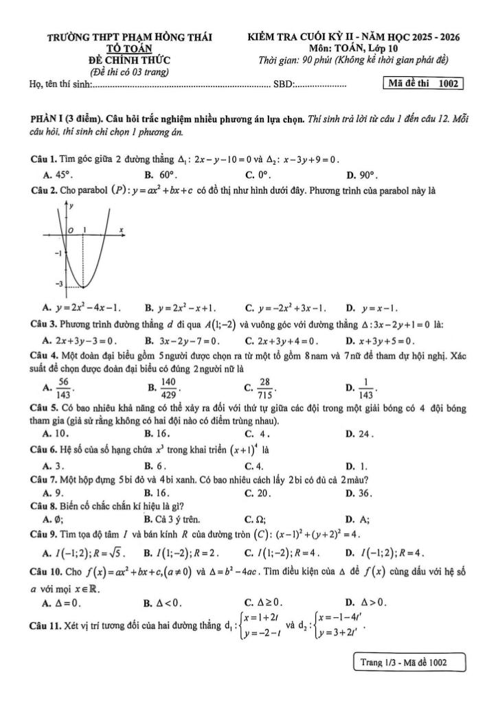Trích dẫn Đề cuối kỳ 2 Toán 10 năm 2025 – 2026 trường THPT Phạm Hồng Thái – Hà Nội: