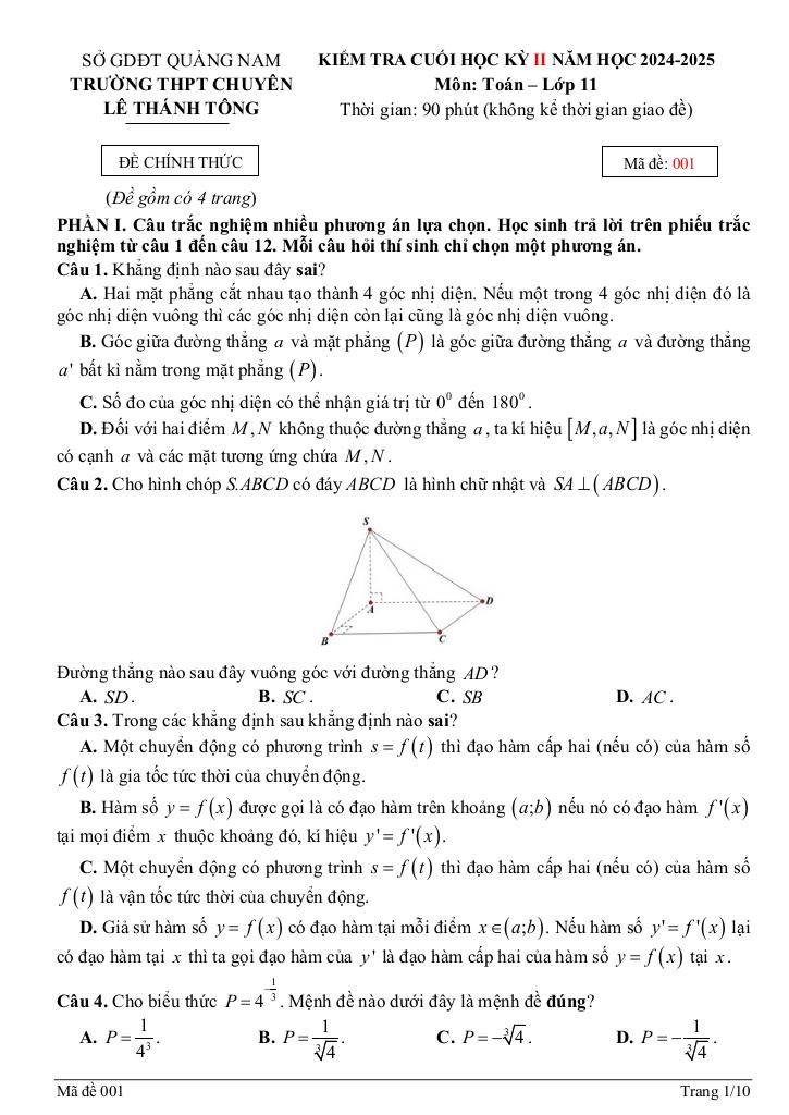 MonToan.com.vn giới thiệu đến quý thầy, cô giáo và các em học sinh lớp 11 đề kiểm tra cuối học kỳ 2 môn Toán 11 năm học 2024 – 2025 trường THPT chuyên Lê Thánh Tông, tỉnh Quảng Nam. Đề thi có đáp án và hướng dẫn chấm điểm.