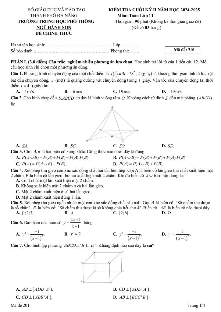 Trích dẫn Đề cuối kỳ 2 Toán 11 năm 2024 – 2025 trường THPT Ngũ Hành Sơn – Đà Nẵng: