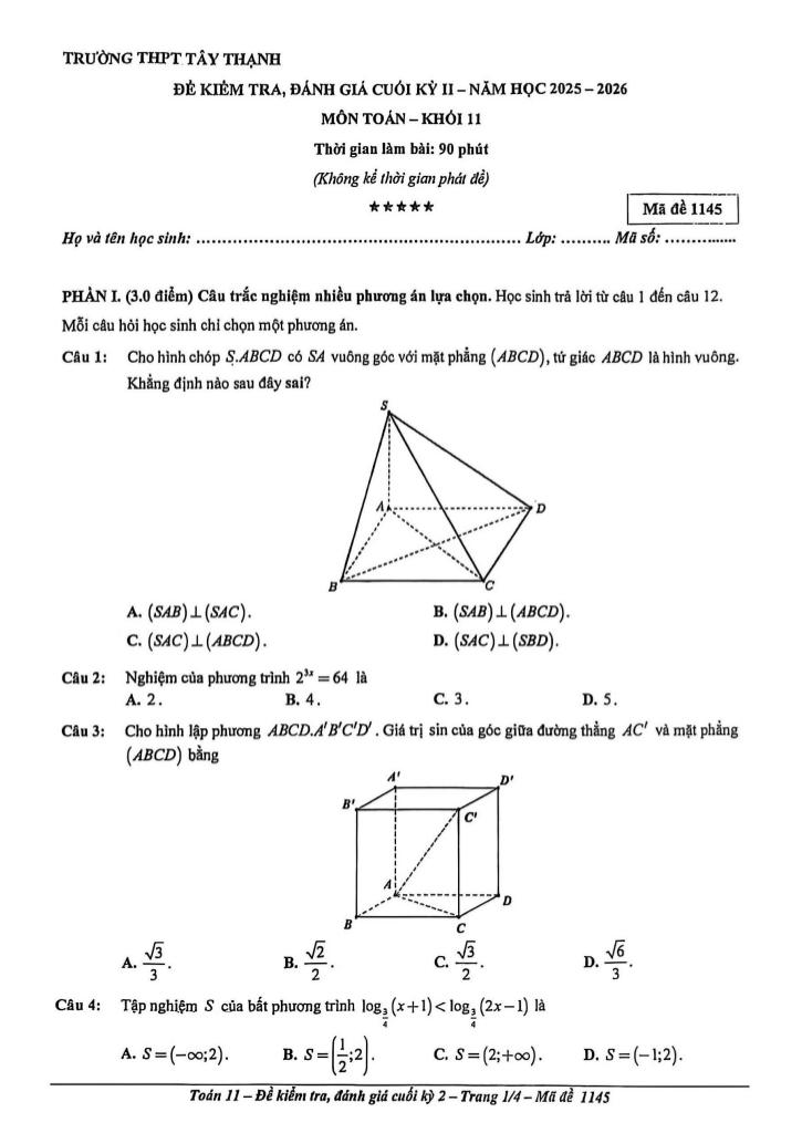 MonToan.com.vn giới thiệu đến quý thầy, cô giáo và các em học sinh đề kiểm tra đánh giá cuối học kỳ 2 môn Toán 11 năm học 2025 – 2026 trường THPT Tây Thạnh, thành phố Hồ Chí Minh. Đề thi cấu trúc 30% trắc nghiệm nhiều phương án lựa chọn + 20% trắc nghiệm đúng sai + 20% trắc nghiệm trả lời ngắn + 30% tự luận, thời gian làm bài 90 phút, có đáp án mã đề 1123 1145 1267 1289.