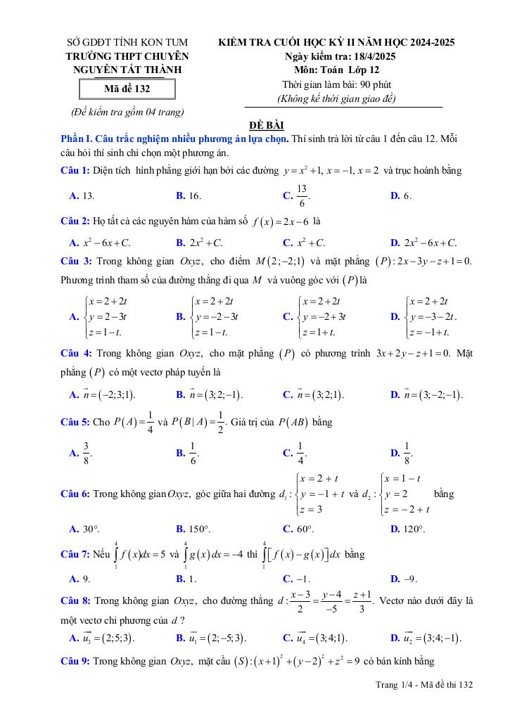 MonToan.com.vn giới thiệu đến quý thầy, cô giáo và các em học sinh lớp 12 đề kiểm tra cuối học kỳ 2 môn Toán 12 năm học 2024 – 2025 trường THPT chuyên Nguyễn Tất Thành, tỉnh Kon Tum. Kỳ thi được diễn ra vào ngày 18 tháng 04 năm 2025. Đề thi có đáp án mã đề 132 209 357 485.