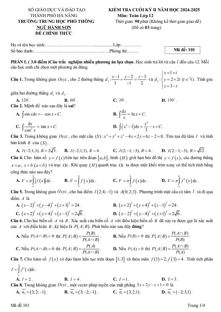 Trích dẫn Đề cuối kỳ 2 Toán 12 năm 2024 – 2025 trường THPT Ngũ Hành Sơn – Đà Nẵng: