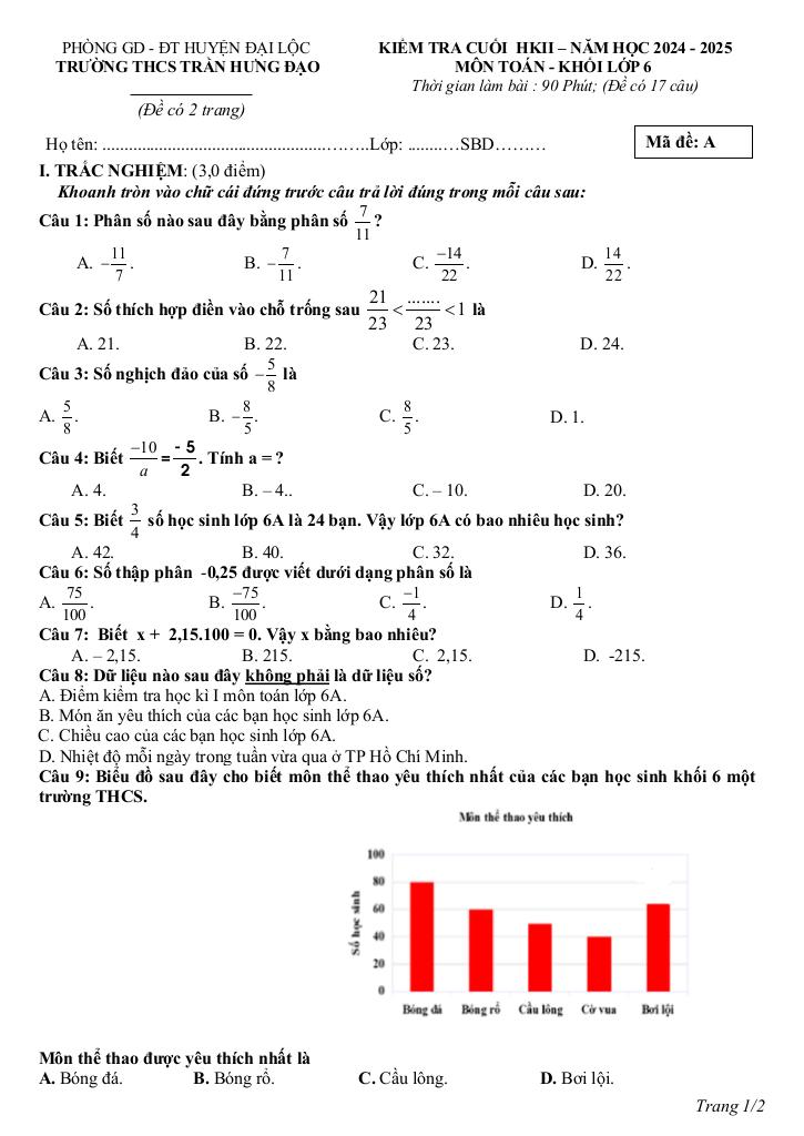 Bạn đang tiếp cận nội dung đề cuối kỳ 2 toán 6 năm 2024 – 2025 trường thcs trần hưng đạo – quảng nam thuộc chuyên mục giải bài toán lớp 6 trên nền tảng môn toán. Bộ bài tập lý thuyết toán thcs này được biên soạn chuyên sâu và bám sát chặt chẽ khung chương trình sách giáo khoa hiện hành, nhằm tối ưu hóa toàn diện quá trình ôn luyện, củng cố kiến thức Toán lớp 6 cho học sinh thông qua phương pháp tiếp cận trực quan và mang lại hiệu quả vượt trội.
