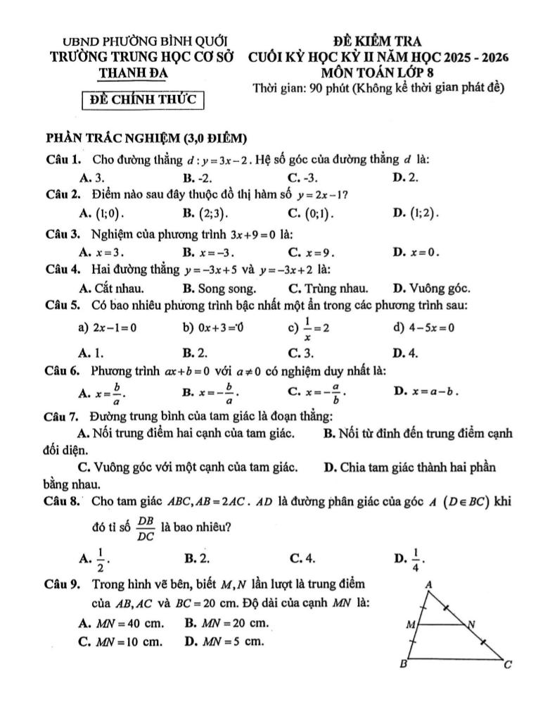 Trích dẫn Đề cuối kỳ 2 Toán 8 năm 2025 – 2026 trường THCS Thanh Đa – TP HCM:
