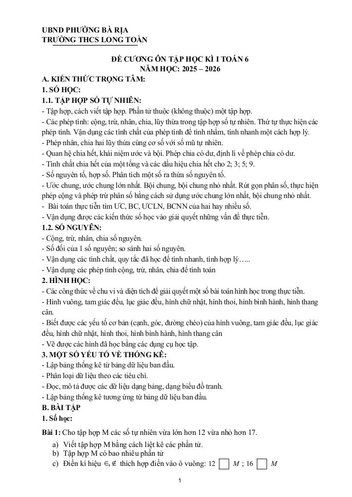 MonToan.com.vn giới thiệu đến quý thầy, cô giáo và các em học sinh đề cương ôn tập cuối học kì 1 môn Toán 6 năm học 2025 – 2026 trường THCS Long Toàn, phường Bà Rịa, thành phố Hồ Chí Minh.
