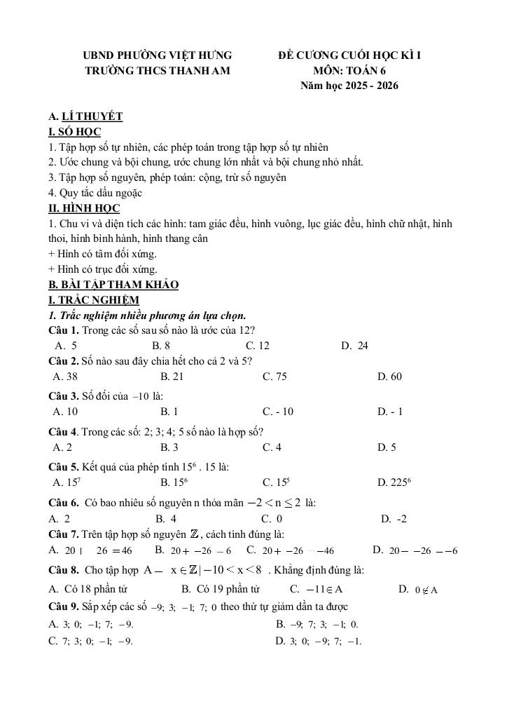 MonToan.com.vn giới thiệu đến quý thầy, cô giáo và các em học sinh đề cương ôn tập kiểm tra cuối học kì 1 môn Toán 6 năm học 2025 – 2026 trường THCS Thanh Am, phường Việt Hưng, thành phố Hà Nội.