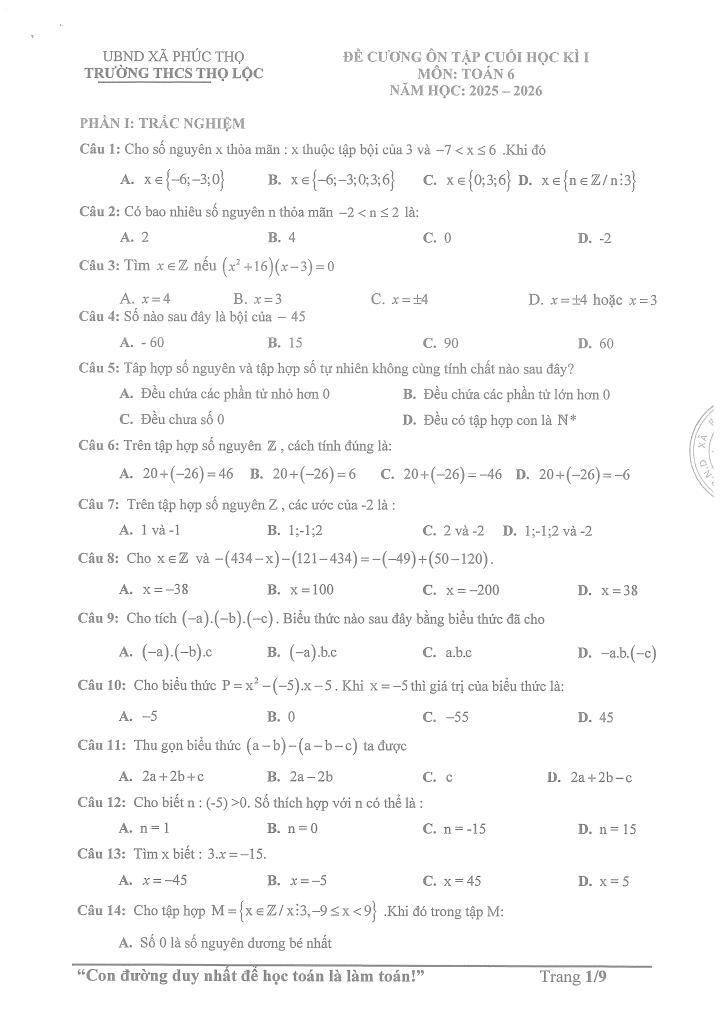 MonToan.com.vn giới thiệu đến quý thầy, cô giáo và các em học sinh đề cương ôn tập cuối học kì 1 môn Toán 6 năm học 2025 – 2026 trường THCS Thọ Lộc, xã Phúc Thọ, thành phố Hà Nội.