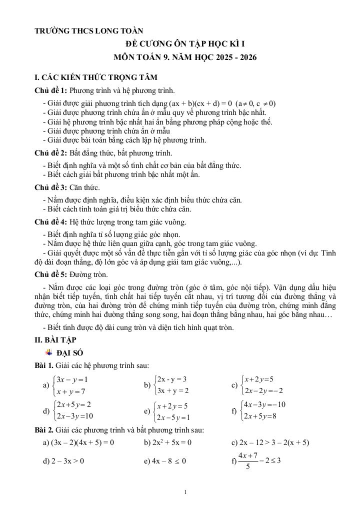 MonToan.com.vn giới thiệu đến quý thầy, cô giáo và các em học sinh đề cương ôn tập cuối học kì 1 môn Toán 9 năm học 2025 – 2026 trường THCS Long Toàn, phường Bà Rịa, thành phố Hồ Chí Minh.