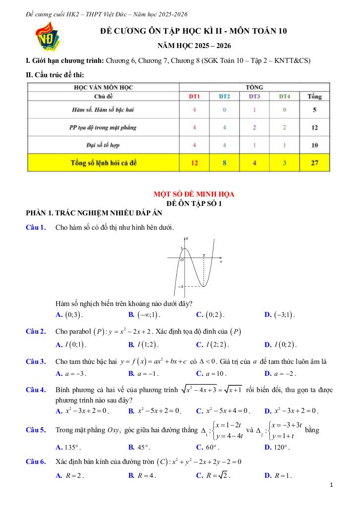 MonToan.com.vn giới thiệu đến quý thầy, cô giáo và các em học sinh đề cương ôn tập cuối học kì 2 môn Toán 10 năm học 2025 – 2026 trường THPT Việt Đức, thành phố Hà Nội.