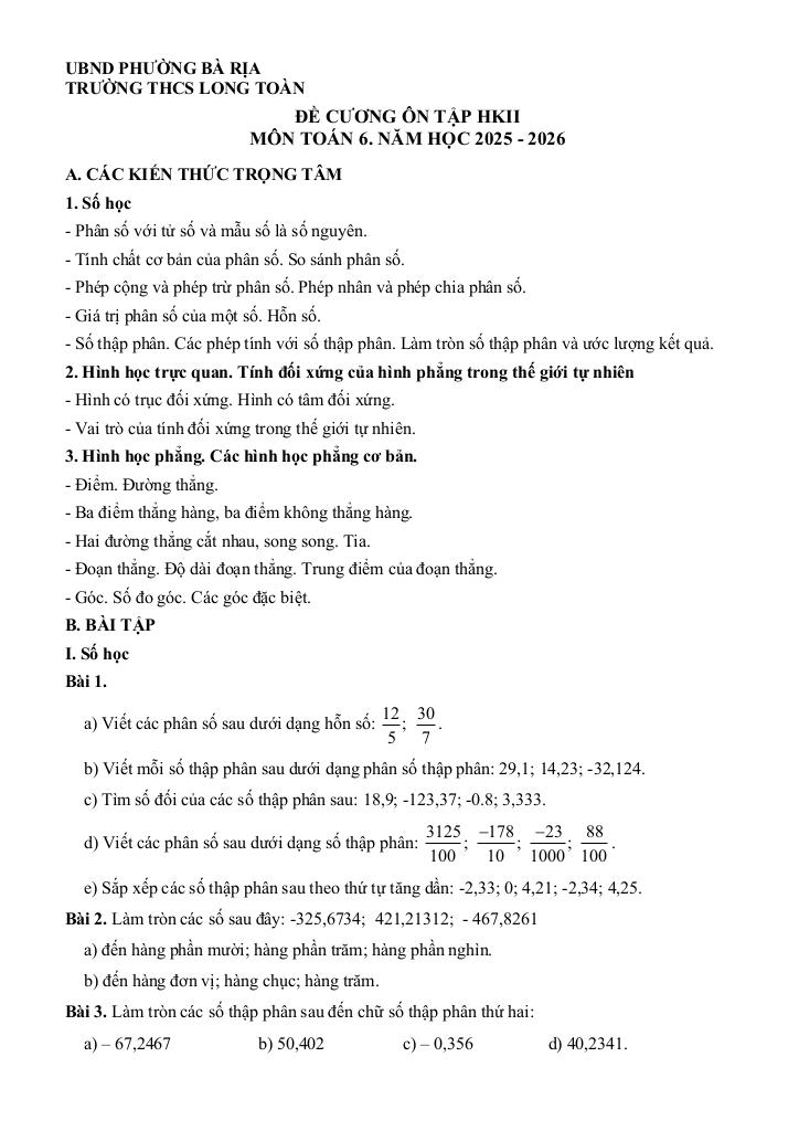 MonToan.com.vn giới thiệu đến quý thầy, cô giáo và các em học sinh đề cương ôn tập cuối học kì 2 môn Toán 6 năm học 2025 – 2026 trường THCS Long Toàn, phường Bà Rịa, thành phố Hồ Chí Minh.