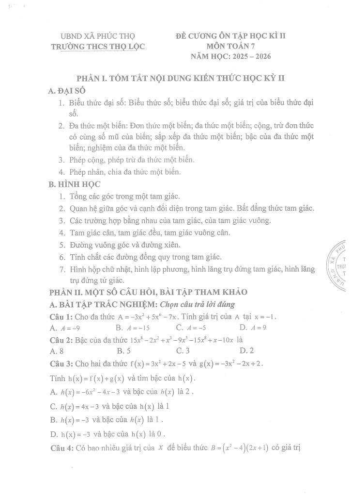 MonToan.com.vn giới thiệu đến quý thầy, cô giáo và các em học sinh đề cương ôn tập cuối học kì 2 môn Toán 7 năm học 2025 – 2026 trường THCS Thọ Lộc, xã Phúc Thọ, thành phố Hà Nội.
