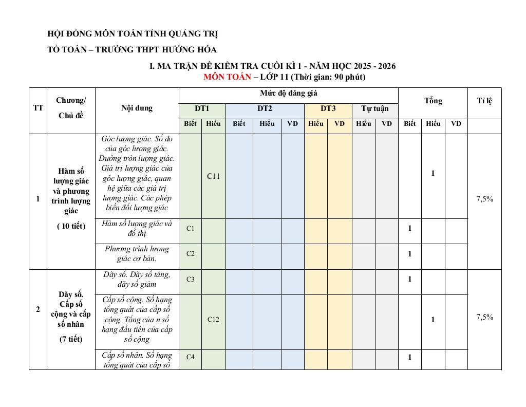MonToan.com.vn giới thiệu đến quý thầy, cô giáo và các em học sinh đề cương ôn tập kiểm tra cuối học kì 1 môn Toán 11 năm học 2025 – 2026 trường THPT Hướng Hóa, tỉnh Quảng Trị.