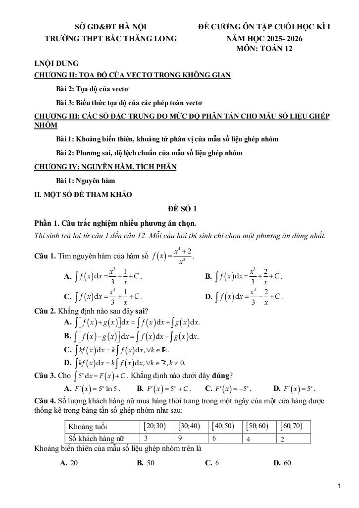 Quý thầy cô và học sinh đang tham khảo đề cương cuối kì 1 toán 12 năm 2025 – 2026 trường thpt bắc thăng long – hà nội, bộ đề thi được xây dựng bám sát chuẩn toán math cập nhật nhất. Cấu trúc đề bảo đảm độ phủ kiến thức đồng đều, mức độ câu hỏi được cân chỉnh từ nhận biết đến vận dụng cao, phù hợp kiểm tra toàn diện năng lực. Hãy khai thác triệt để tài liệu này để đánh giá chính xác trình độ hiện tại và tối ưu chiến lược luyện thi của bạn.
