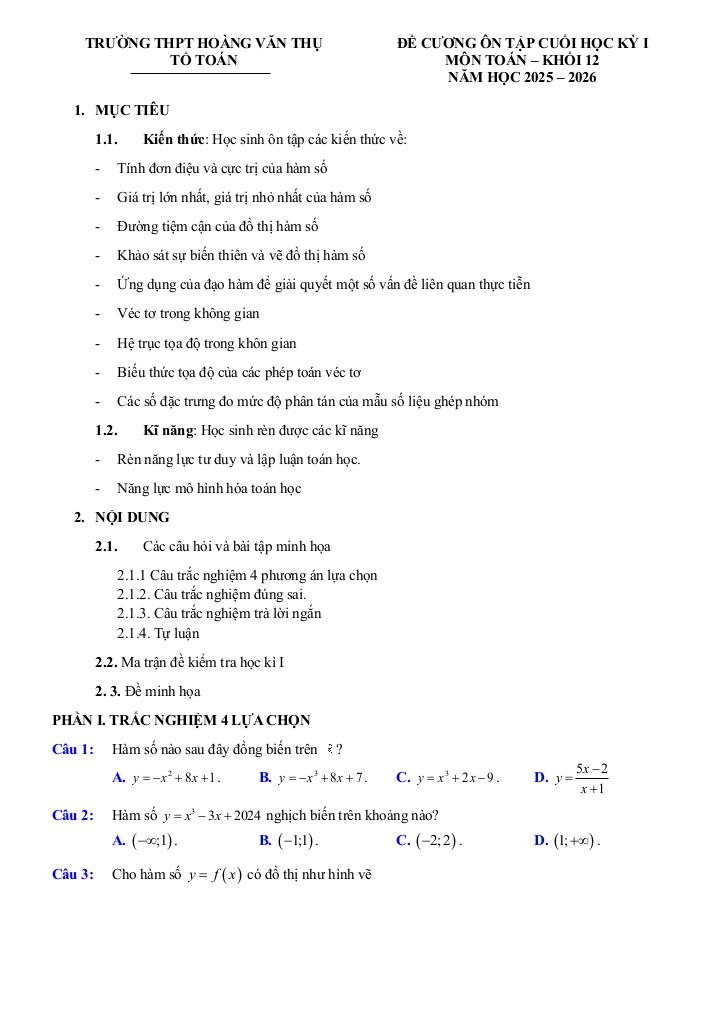 MonToan.com.vn giới thiệu đến quý thầy, cô giáo và các em học sinh đề cương ôn tập cuối học kỳ 1 môn Toán 12 năm học 2025 – 2026 trường THPT Hoàng Văn Thụ, thành phố Hà Nội.