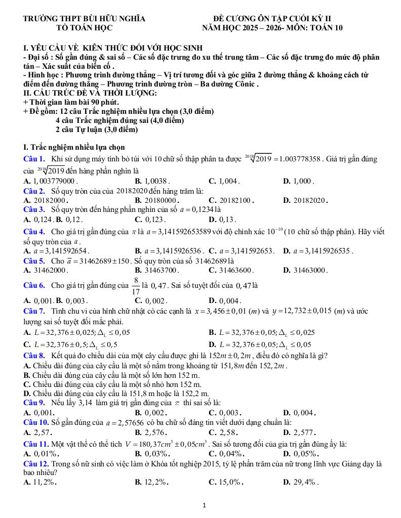 MonToan.com.vn giới thiệu đến quý thầy, cô giáo và các em học sinh đề cương ôn tập cuối học kỳ 2 môn Toán 10 năm học 2025 – 2026 trường THPT Bùi Hữu Nghĩa, thành phố Cần Thơ.