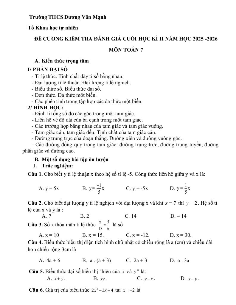 MonToan.com.vn giới thiệu đến quý thầy, cô giáo và các em học sinh đề cương ôn tập kiểm tra đánh giá cuối học kỳ 2 môn Toán 7 năm học 2025 – 2026 trường THCS Dương Văn Mạnh, thành phố Hồ Chí Minh.