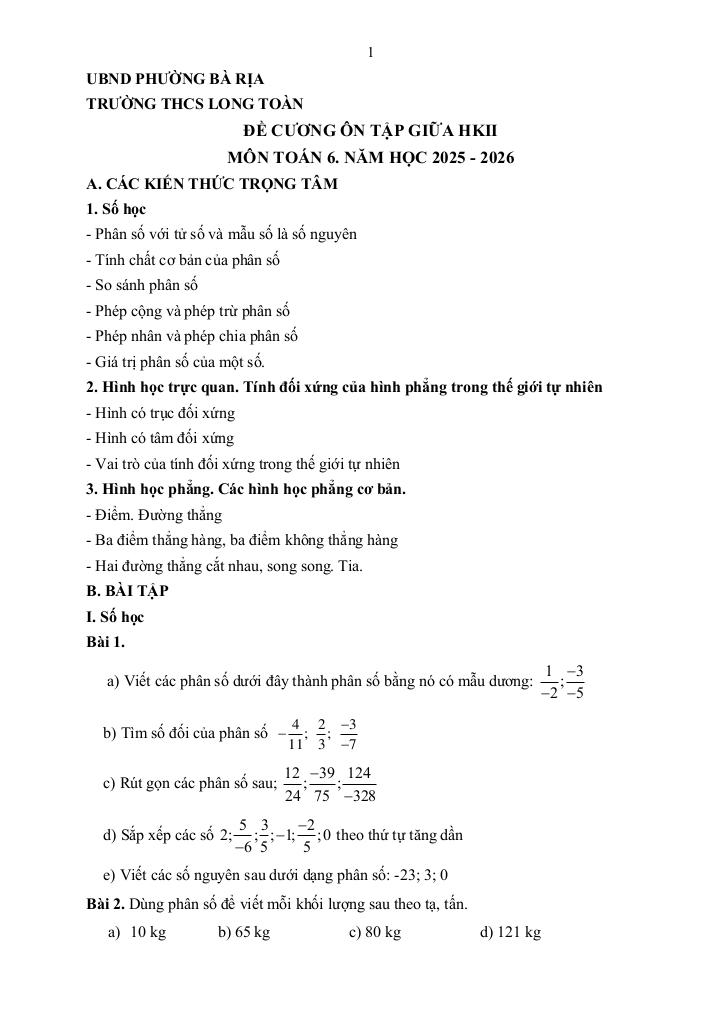 MonToan.com.vn giới thiệu đến quý thầy, cô giáo và các em học sinh đề cương ôn tập giữa học kì 2 môn Toán 6 năm học 2025 – 2026 trường THCS Long Toàn, phường Bà Rịa, thành phố Hồ Chí Minh.