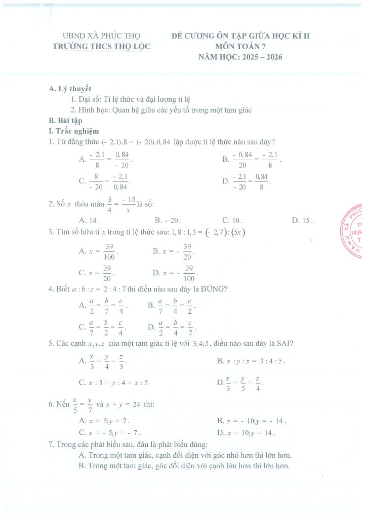 MonToan.com.vn giới thiệu đến quý thầy, cô giáo và các em học sinh đề cương ôn tập giữa học kì 2 môn Toán 7 năm học 2025 – 2026 trường THCS Thọ Lộc, xã Phúc Thọ, thành phố Hà Nội.
