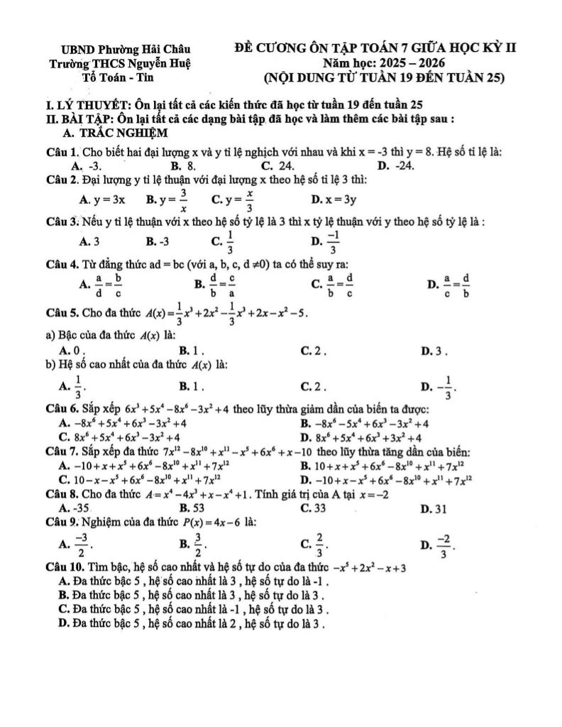 MonToan.com.vn giới thiệu đến quý thầy, cô giáo và các em học sinh đề cương ôn tập giữa học kỳ 2 môn Toán 7 năm học 2025 – 2026 trường THCS Nguyễn Huệ, phường Hải Châu, thành phố Đà Nẵng.