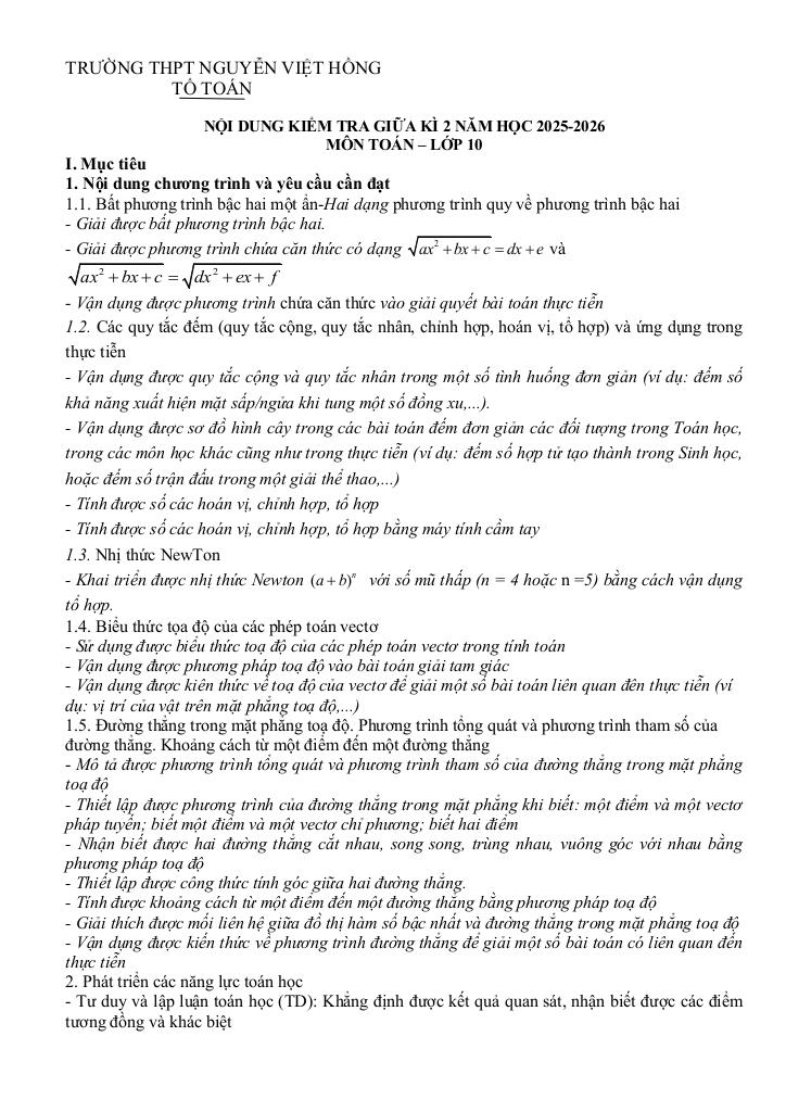 MonToan.com.vn giới thiệu đến quý thầy, cô giáo và các em học sinh đề cương ôn tập kiểm tra giữa học kì 2 môn Toán 10 năm học 2025 – 2026 trường THPT Nguyễn Việt Hồng, thành phố Cần Thơ.