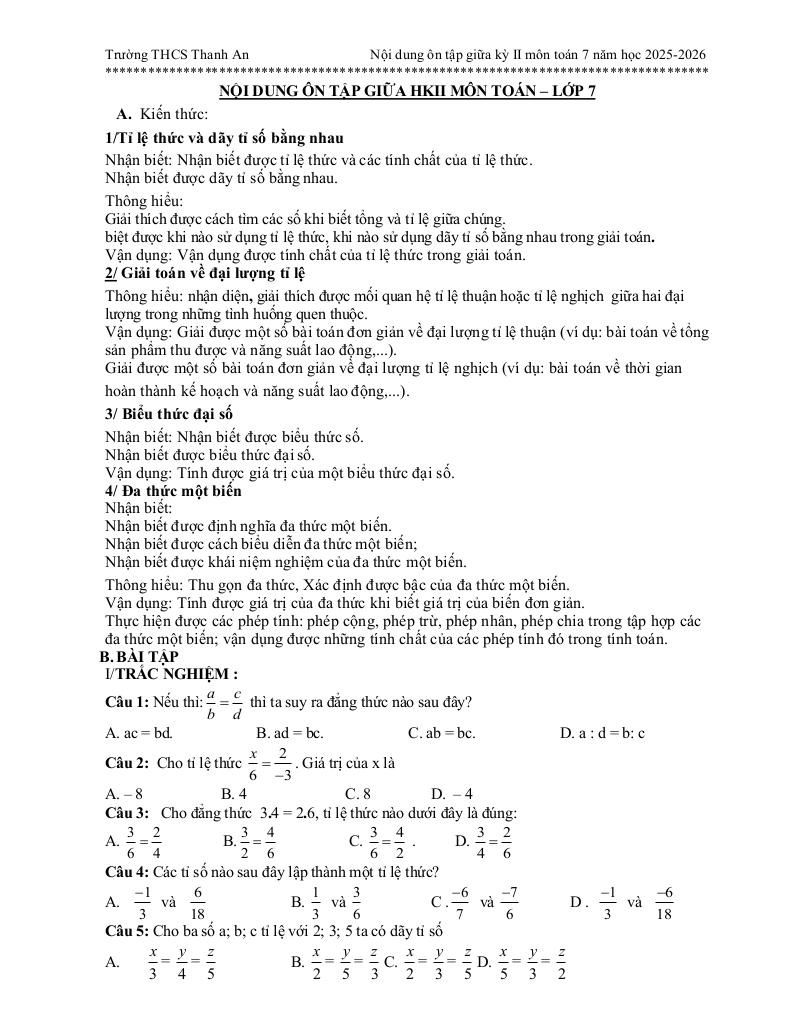 MonToan.com.vn giới thiệu đến quý thầy, cô giáo và các em học sinh đề cương ôn tập giữa học kì 2 môn Toán 7 năm học 2025 – 2026 trường THCS Thanh An, tỉnh Quảng Trị.
