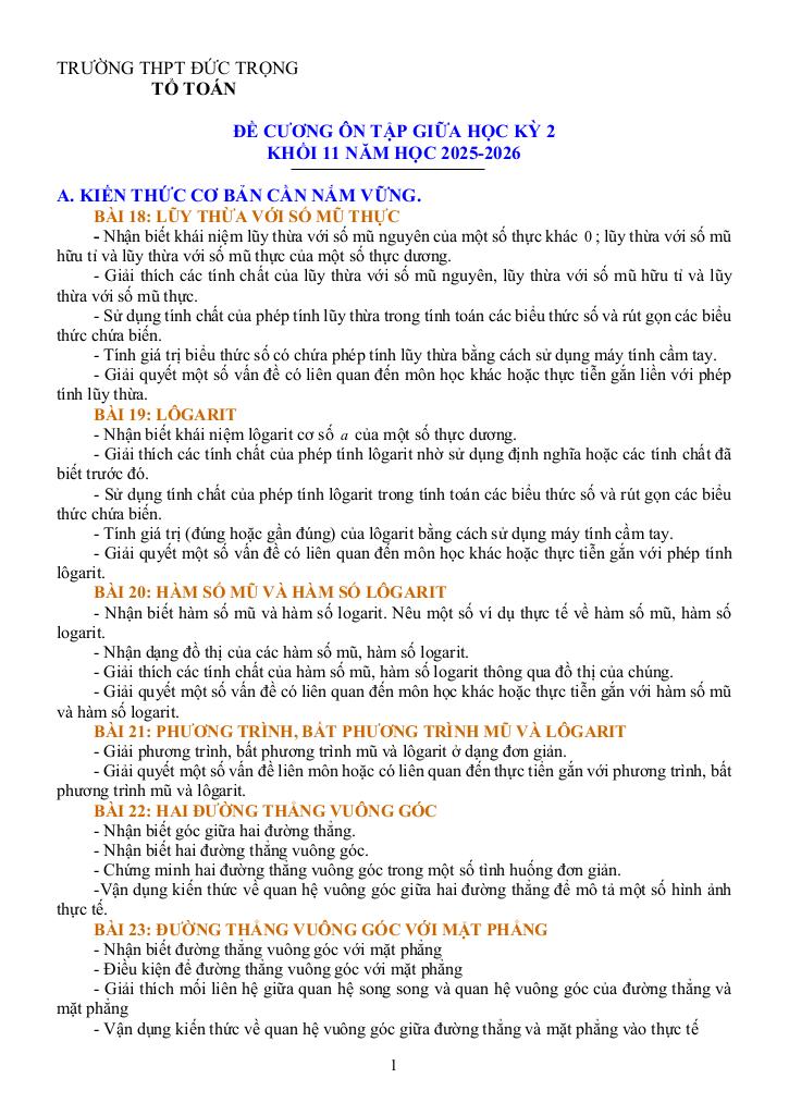 MonToan.com.vn giới thiệu đến quý thầy, cô giáo và các em học sinh đề cương ôn tập giữa học kỳ 2 môn Toán 11 năm học 2025 – 2026 trường THPT Đức Trọng, tỉnh Lâm Đồng.