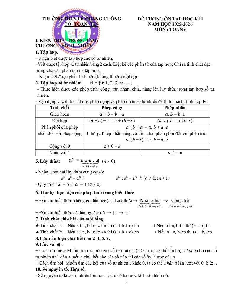 MonToan.com.vn giới thiệu đến quý thầy, cô giáo và các em học sinh đề cương ôn thi cuối học kì 1 môn Toán 6 năm học 2025 – 2026 trường THCS Lê Quang Cường, thành phố Hồ Chí Minh.
