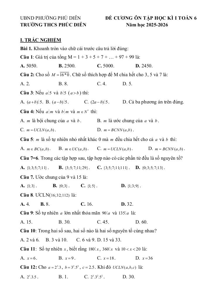 Quý thầy cô và học sinh đang tham khảo đề cương học kì 1 toán 6 năm 2025 – 2026 trường thcs phúc diễn – hà nội, bộ đề thi được xây dựng bám sát chuẩn môn toán cập nhật nhất. Cấu trúc đề bảo đảm độ phủ kiến thức đồng đều, mức độ câu hỏi được cân chỉnh từ nhận biết đến vận dụng cao, phù hợp kiểm tra toàn diện năng lực. Hãy khai thác triệt để tài liệu này để đánh giá chính xác trình độ hiện tại và tối ưu chiến lược luyện thi của bạn.