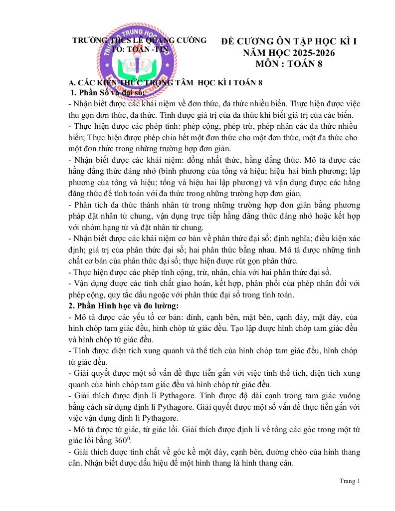 MonToan.com.vn giới thiệu đến quý thầy, cô giáo và các em học sinh đề cương ôn thi cuối học kì 1 môn Toán 8 năm học 2025 – 2026 trường THCS Lê Quang Cường, thành phố Hồ Chí Minh.