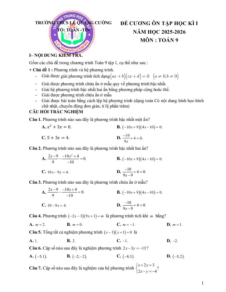 MonToan.com.vn giới thiệu đến quý thầy, cô giáo và các em học sinh đề cương ôn thi cuối học kì 1 môn Toán 9 năm học 2025 – 2026 trường THCS Lê Quang Cường, thành phố Hồ Chí Minh.