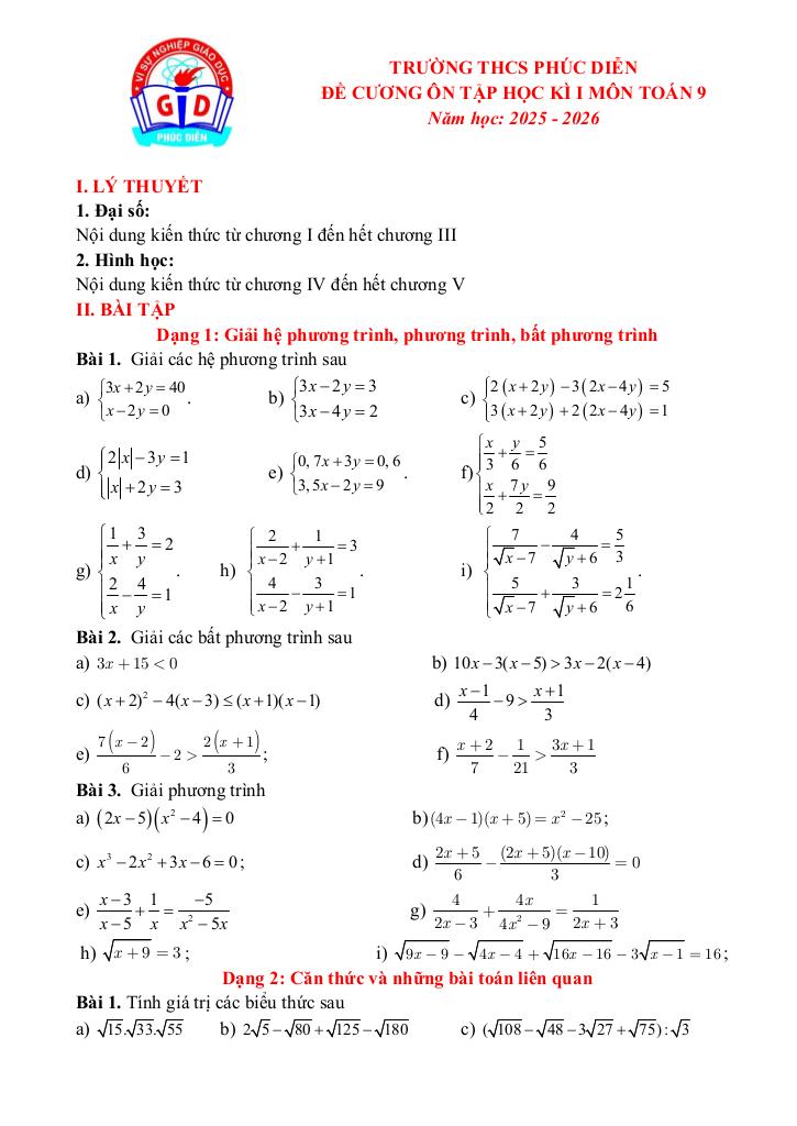 Quý thầy cô và học sinh đang tham khảo đề cương học kì 1 toán 9 năm 2025 – 2026 trường thcs phúc diễn – hà nội, bộ đề thi được xây dựng bám sát chuẩn toán cập nhật nhất. Cấu trúc đề bảo đảm độ phủ kiến thức đồng đều, mức độ câu hỏi được cân chỉnh từ nhận biết đến vận dụng cao, phù hợp kiểm tra toàn diện năng lực. Hãy khai thác triệt để tài liệu này để đánh giá chính xác trình độ hiện tại và tối ưu chiến lược luyện thi của bạn.
